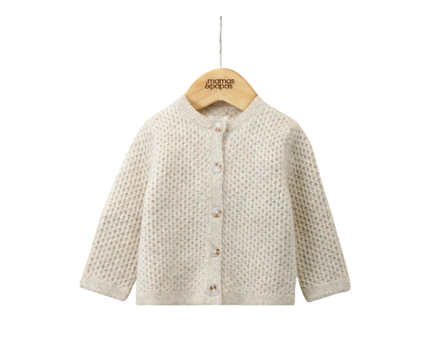 This soft oatmeal knitted cardigan is perfect for layering on cooler days. Featuring long sleeves and a front button fastening, its neutral colour makes it versatile for pairing with any outfit. Cozy and stylish, it’s ideal for everyday wear or adding an extra layer of warmth for little ones.