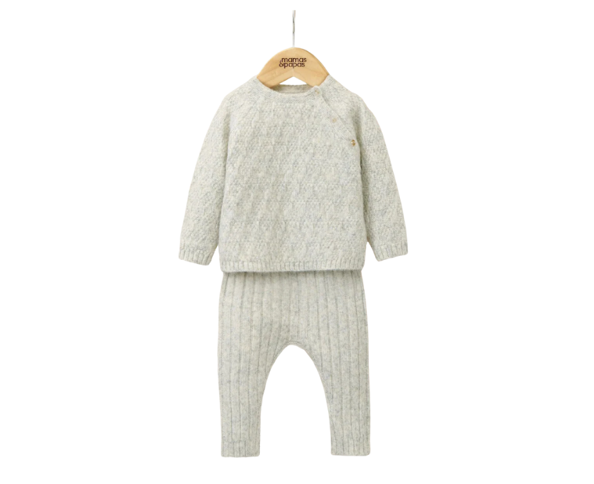 The Knitted Top & Leggings Set in grey marl is a cosy and comfortable 2-piece outfit for baby boys, perfect for cooler days. Featuring a long-sleeved knitted top with raglan button opening and ribbed cuffs and hem, paired with matching leggings with a stretchy waistband for easy movement. Ideal for everyday wear or layering for a warm boys’ outfit.