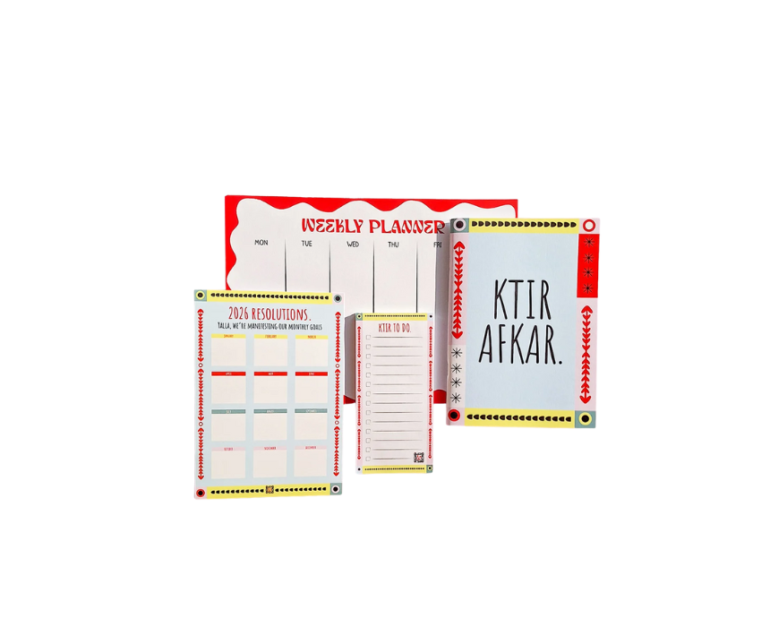 This limited edition 2026 planning bundle includes a Weekly Planner, Ktir To Do Notepad, Ktir Afkar Sketchbook, and a 2026 Resolution Reminder Card to keep the year organized and inspired. Hand illustrated and printed on recycled paper in Lebanon, it brings together planning, creativity, and motivation in one thoughtful set. Style it on a desk or workspace as a cohesive stationery collection ready to plan, dream, and do.