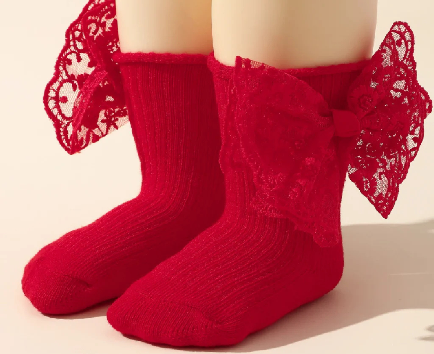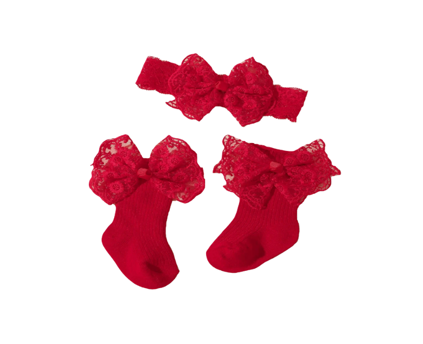 Dress your baby girl in style with this Red Lace Bow Headband and Socks Set, featuring soft cotton socks with delicate lace bows and a matching stretchy headband. Perfect for birthdays, family photos, holidays, or everyday wear, this set combines comfort and charm for babies aged 6–12M. A sweet and practical outfit accessory for every occasion.