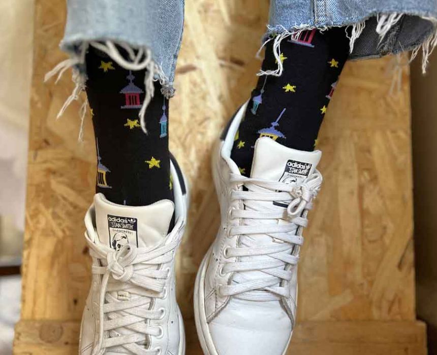Our Lantern Socks in Black, made from 78% premium combed cotton, 20% polyamide, and 2% elastane, feature pink, purple, and light blue lanterns against a black background. These socks celebrate the “Fanoos” or lantern, a symbol of hope and light during the Holy month of Ramadan. Wear them with your loved ones to break fast together and cherish the sense of togetherness