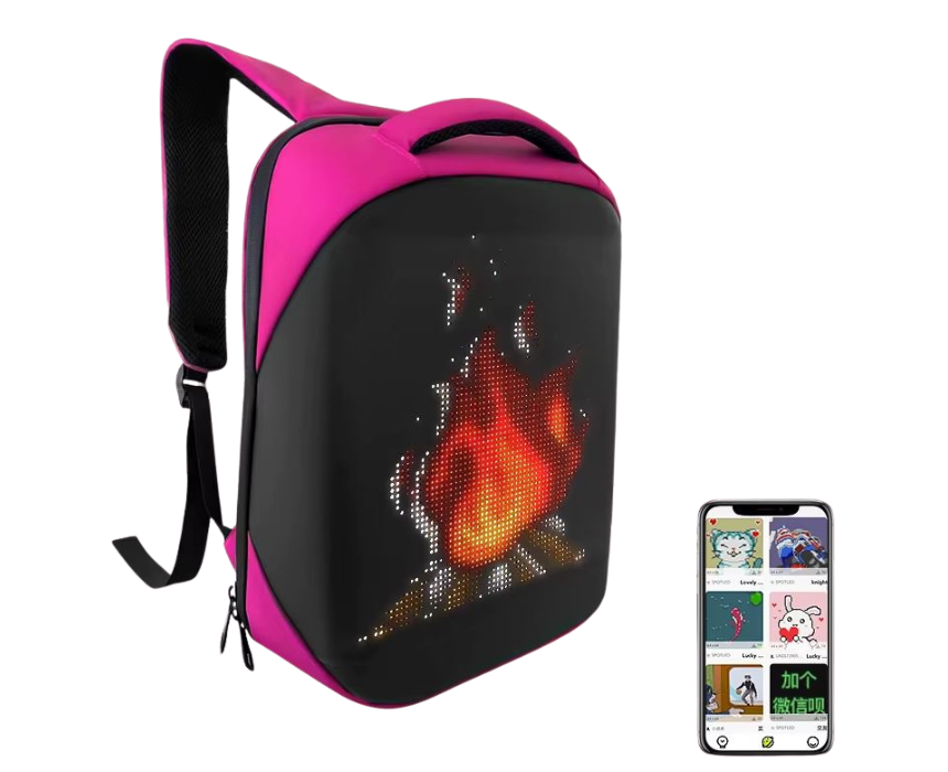 The Laptop Backpack with LED Screen in pink combines functionality with modern tech, featuring a built-in LED display for personalization and smart storage for laptops and daily essentials. Its vibrant pink color adds a bold, stylish touch that pairs well with casual or urban outfits and is worn comfortably on the back with adjustable padded straps. Perfect for students, commuters, and tech enthusiasts who want both style and innovation.