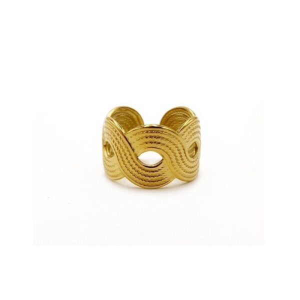 The Lava Flow Ring features a striking 18K gold plated stainless steel design with an adjustable band for a comfortable fit. Its bold, textured surface mimics the natural flow of lava, creating a unique, eye-catching statement piece. Perfect for both casual and formal wear, this versatile ring can be worn alone for a minimalist look or stacked with other rings for a trendy, layered style. Add a touch of modern elegance and sophistication to any outfit with this one-of-a-kind ring.
