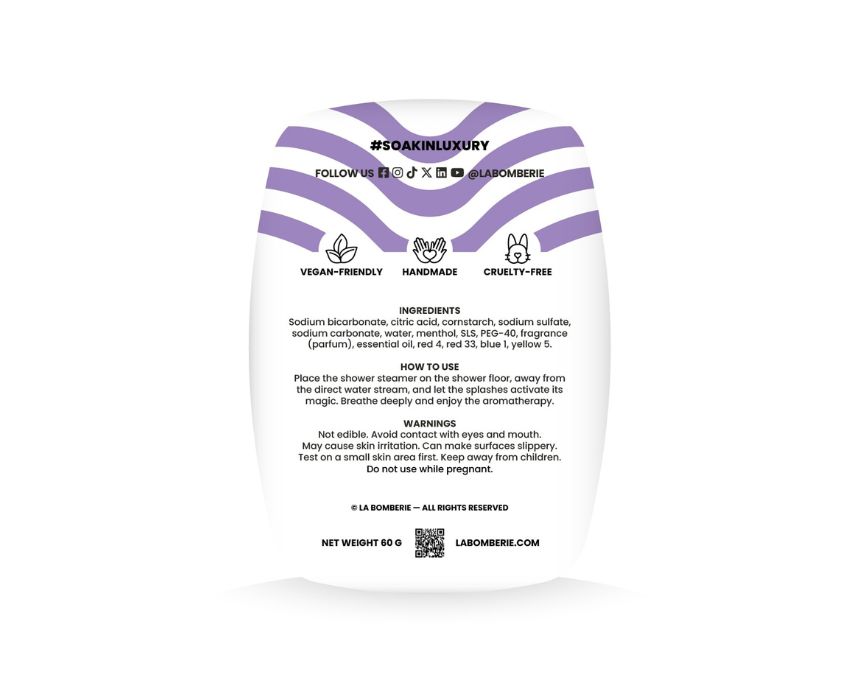 La Bomberie Lavender Shower Steamer 60 g turns your shower into a calming spa-like experience with its soothing lavender haze aroma. To use, place it on the shower floor where water lightly splashes to activate the scent. Perfect for winding down after a long day or creating a peaceful start to your evening routine.