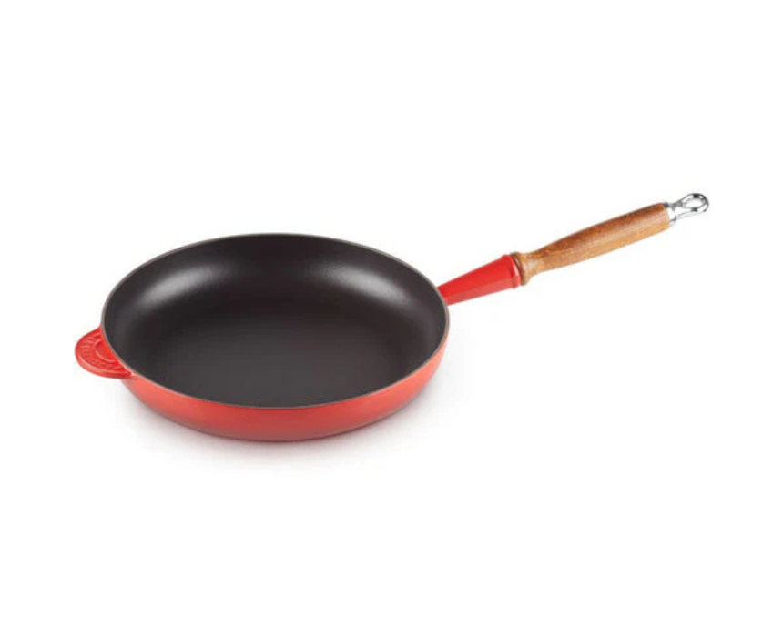 The Le Creuset Evo Frypan 28cm in Cherry combines a durable cast iron body with a stylish wooden handle, ideal for frying, sautéing, and searing. Its 28cm size ensures even heat distribution for perfect cooking results, while the vibrant cherry finish adds a touch of elegance to any kitchen. Designed for stovetop and oven use, it offers both functionality and modern style.