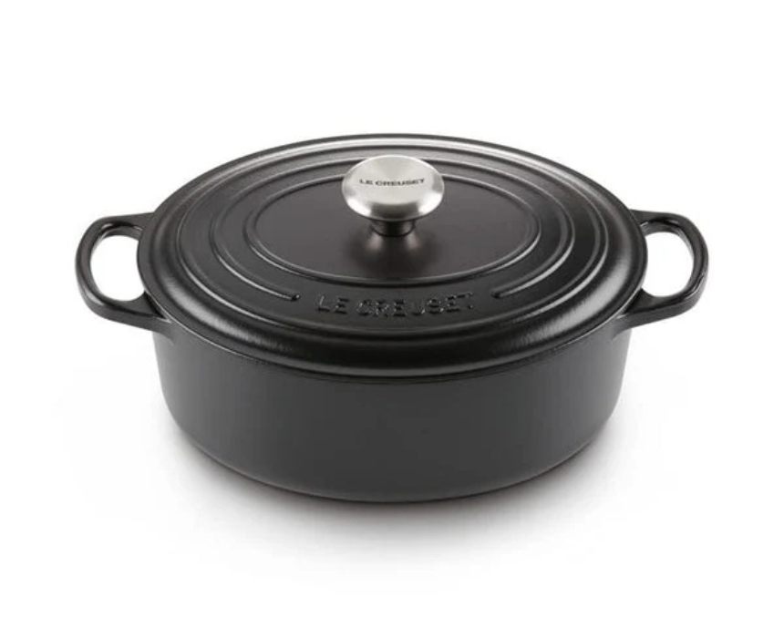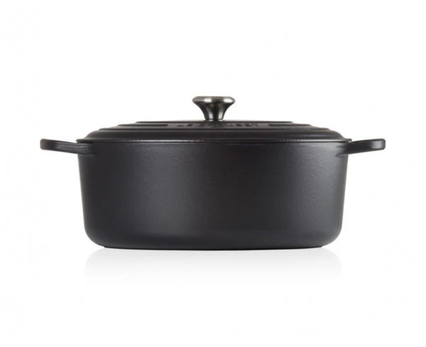 The Le Creuset Oval French Oven Evo 33cm in black is crafted from durable cast iron, delivering exceptional heat retention and even cooking for slow braises, roasts, and stews. Its spacious oval shape is ideal for large cuts of meat and family meals while being suitable for stovetop and oven use. For best presentation, it can be styled by serving dishes directly from oven to table for an elegant and timeless look.