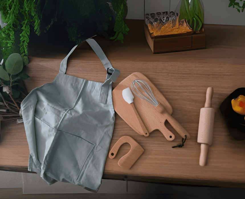 The Le P’tit Sous Chef Kids Baking Set inspires young bakers to create with confidence. Featuring a wooden rolling pin, whisk, chopping board, knife, silicone spatula, adjustable mini apron, and bag, all perfectly sized for small hands, it encourages creativity, skill-building, and family fun. Made from smooth natural beech wood, it’s ideal for mixing, measuring, rolling, and decorating, letting kids bake safely with a touch of adult guidance Designed for kids aged 3+