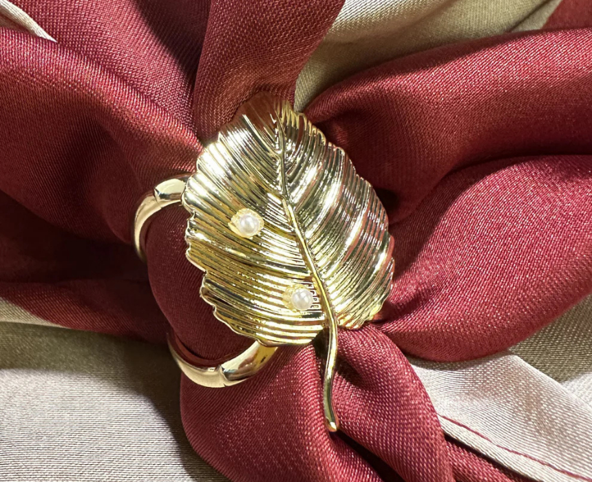 The Leaf Scarf Buckle is crafted from gold tone metal alloy, featuring a delicate leaf-inspired design that adds a natural, elegant touch to any outfit. It secures scarves effortlessly while enhancing your styling with a refined, decorative accent. Simply slide your scarf through the buckle for structured, polished drapes suitable for both casual and formal looks.