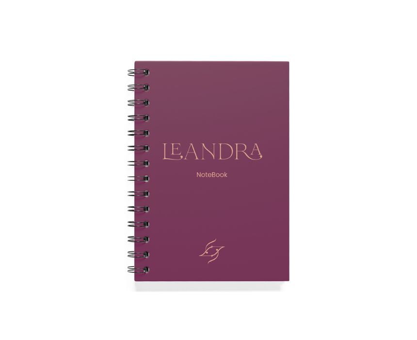 The Leandra Notebook features an A5 size with 50 or 100 pages of beige lined paper, housed in a burgundy and beige hardcover with a matte finish. Perfect for journaling, poetry, or sketches, it is crafted for the modern woman who values beauty, wisdom, and alignment in her daily life. Its elegant design fits effortlessly into any workspace or bag, making it a thoughtful companion for creative and mindful moments.