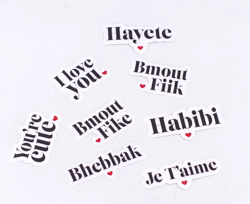 The Lebanese Love sticker pack features a charming collection of vinyl stickers in a compact 10.5 by 10.5 centimeter size. This romantic set includes bilingual and culturally iconic phrases like Habibi, Hayete, and Bhebak designed for lasting durability and style. Style these stickers by applying your favorite terms of endearment to the back of a smartphone or personalizing a travel thermos to keep a piece of home and heart with you everywhere you go.