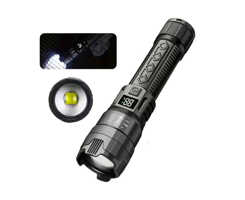 The LED Tactical Flashlight with Digital Display offers super-bright illumination, telescopic zoom, and a USB Type-C fast-charging system for quick, convenient power. Its rugged, lightweight design and long-lasting 18650 battery make it ideal for camping, emergencies, tactical use, and outdoor activities. Compact and reliable, it ensures powerful performance whenever needed.