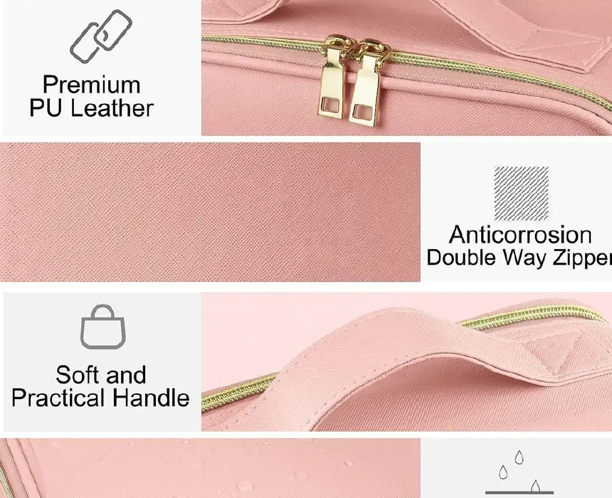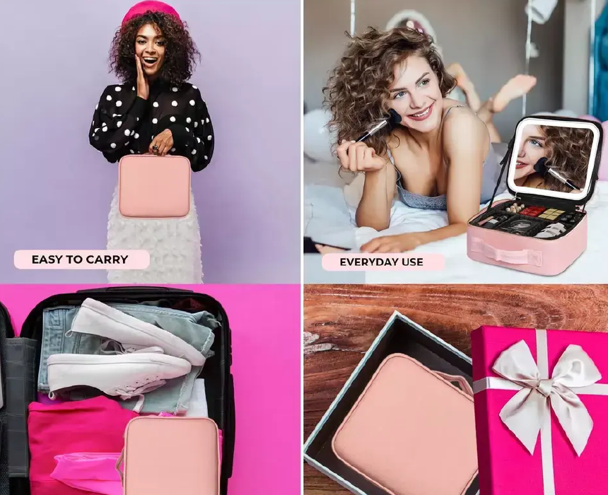 The LED Travel Makeup Bag is a stylish, multifunctional beauty organizer with an integrated three-color LED mirror for perfect lighting anywhere. Its customizable storage layout, made from eco-friendly Safiano synthetic leather, ensures durability and elegance. Waterproof, dustproof, and portable, it fits seamlessly into luggage or daily use, keeping cosmetics secure and organized. Ideal for makeup lovers, this chic travel essential ensures flawless beauty on the go.