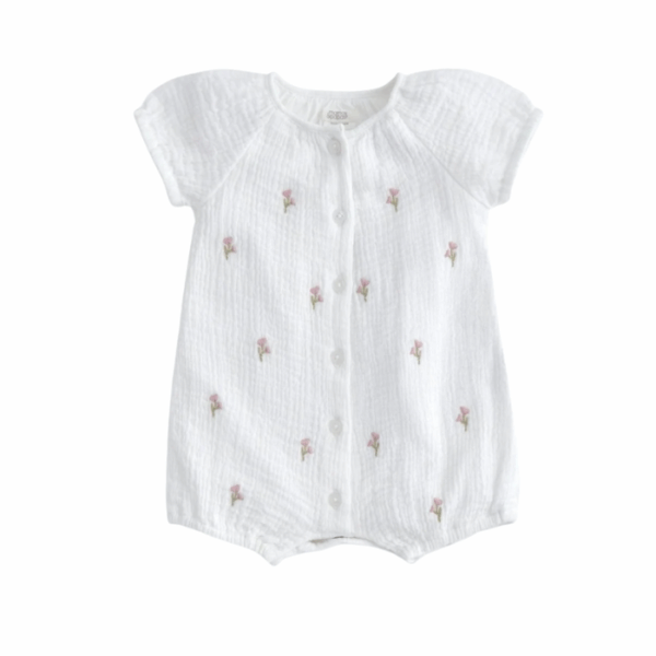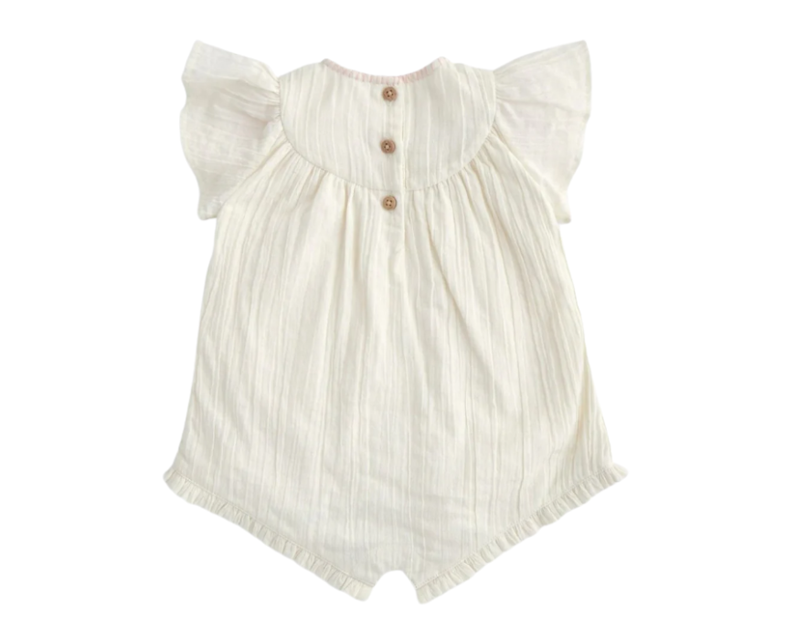 This Lemon Embroidered Romper in yellow is a cute and comfortable 100% cotton outfit, featuring delicate lemon embroidery, frill sleeves, blanket stitch detailing, and practical back button and popper gusset openings for easy dressing. Perfect for everyday wear or sunny holidays, it can be styled with sandals or a sunhat for a fresh, cheerful look.