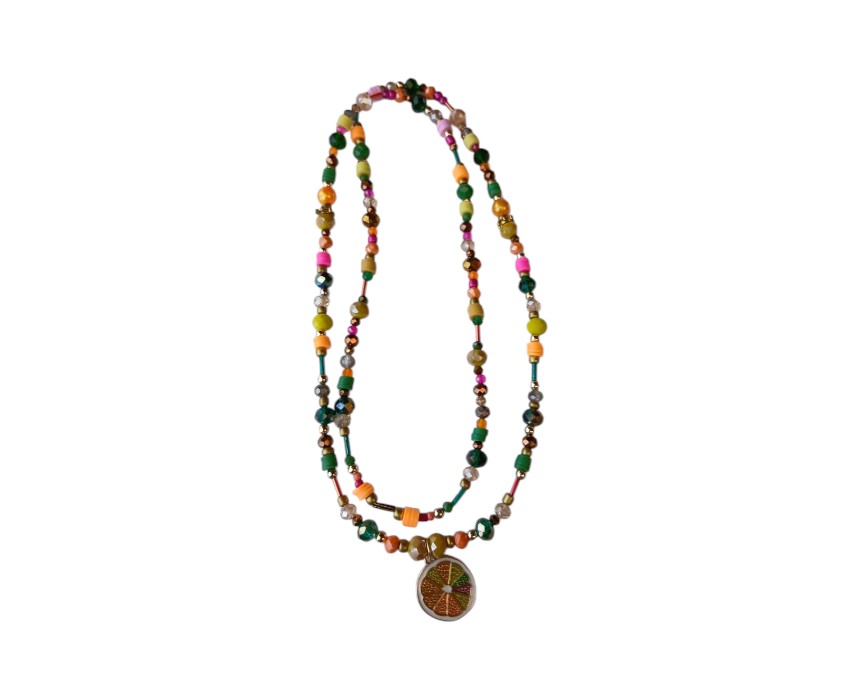 Add a squeeze of fun to your style with the “Lemon” necklace. This long handmade piece features an eclectic mix of small and big crystals, colorful beads, and golden separators. The highlight is a unique lemon-shaped colored pendant that brings a playful, summery vibe to the design. Perfect for casual outings or brightening up your daily routine, this durable necklace is a conversation starter that celebrates creative and lighthearted handmade art.