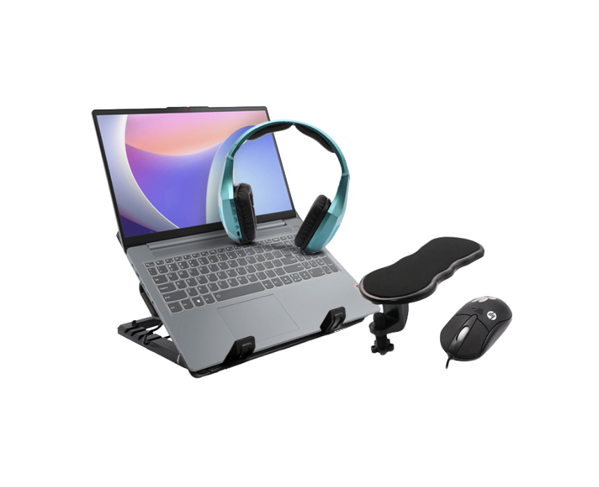 This Lenovo IdeaPad Slim3 bundle features an Intel Core i3 laptop for reliable performance, paired with a Bluetooth S33 headphone for wireless convenience, an Ergostand 979 cooling pad for optimal airflow, a mouse arm bracket for comfort, and a wired HP Flower mouse for smooth navigation. Style your setup with the sleek accessories and enjoy hands-free audio while working or studying.