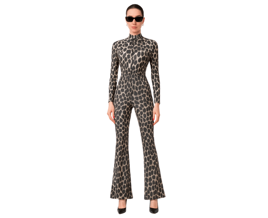 Statement leopard print jumpsuit in soft satin-style fabric, featuring a slim body-hugging top, wide flared legs, and a hidden front zipper for easy wear. Available in S-M.