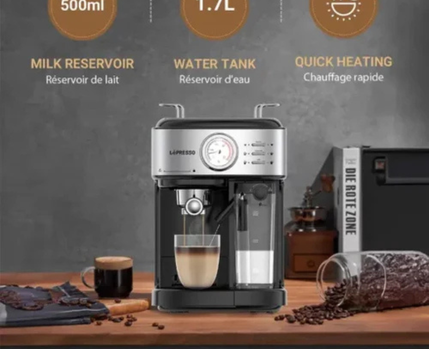 LePresso Coffee Machine 20 Bar with Capsule Filter & Milk Tank delivers barista-quality espresso, cappuccino, and latte at home with ease. The 20-bar pressure system ensures rich, flavorful coffee, while the capsule filter and built-in milk tank allow convenient brewing and frothing. Its sleek design fits any kitchen, making it perfect for daily use or entertaining guests with professional-style drinks.