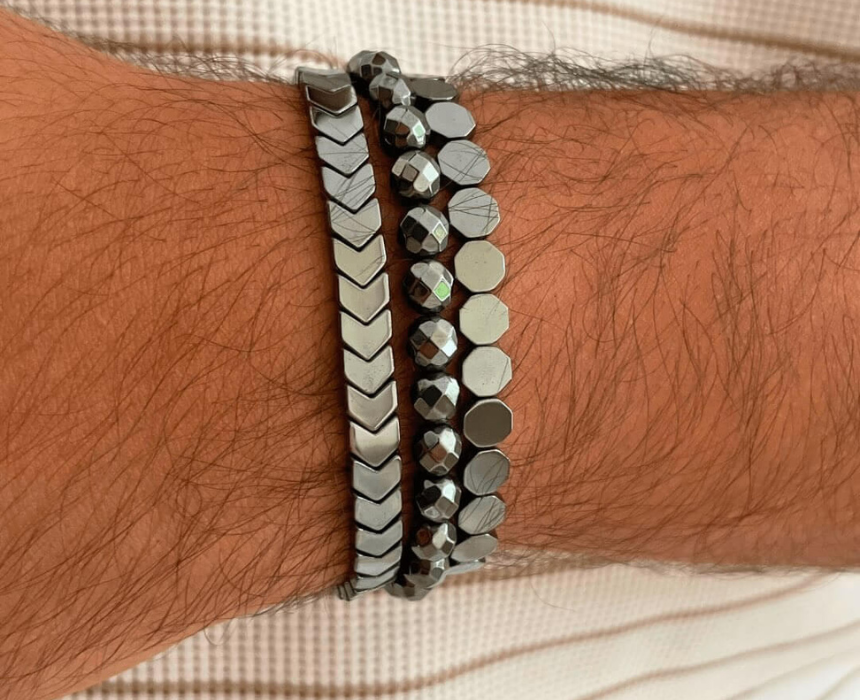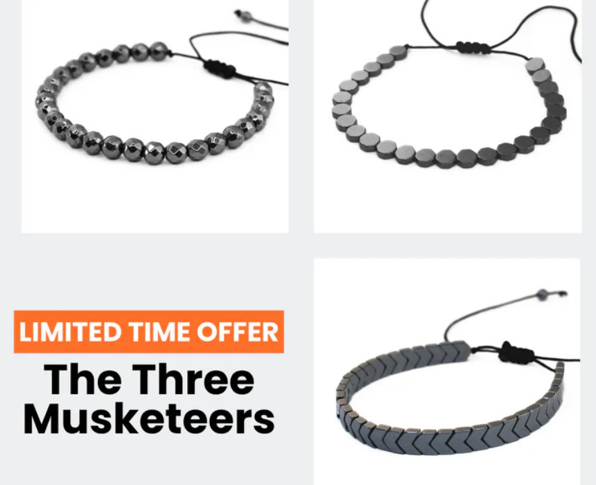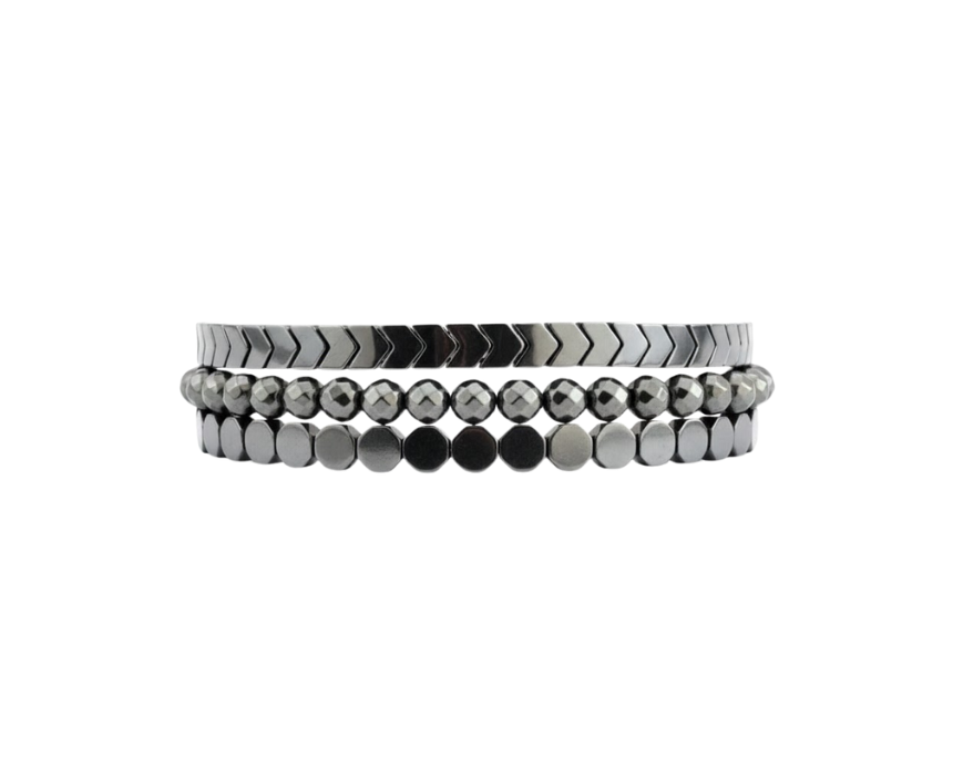 Les Trois Mousquetaires unites three hand-carved hematite bracelets—007 with arrow-shaped beads for focus, Titan with rugged natural-cut stones for strength, and Le Raffiné with polished octagonal design for refined clarity. Together, they create a powerful trio that balances grounding energy, purpose, and style for the modern gentleman. This collection pairs effortlessly with both formal and casual looks.