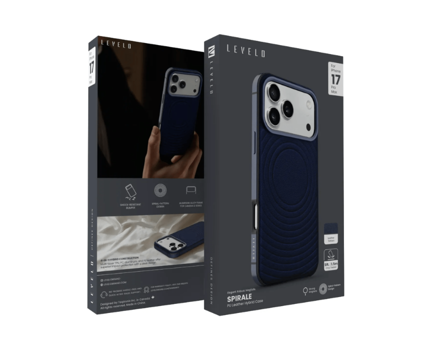 The Levelo Spirale PU leather hybrid case is designed to protect the iPhone 17 Pro and Pro Max with a refined and modern look. It features a leather textured finish with a spiral design, reinforced protection for the camera and buttons, and strong MagSafe compatibility for accessories. Ideal for daily use, it combines durability, comfort, and elegant styling in a slim protective form.