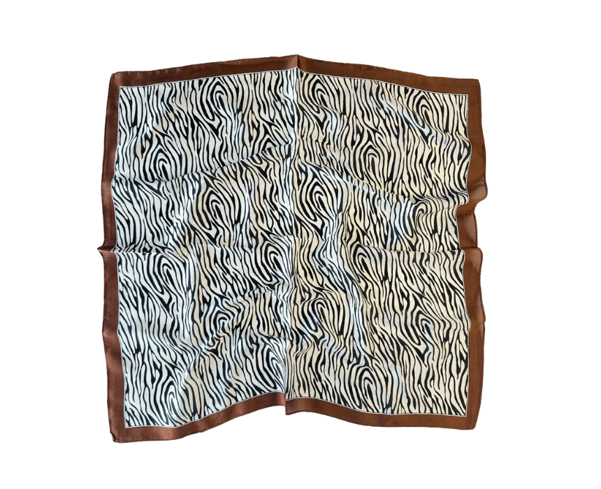 The Lignes Fauves scarf features organic black and ivory lines on smooth synthetic satin, inspired by the untamed elegance of nature’s patterns. Measuring 66 × 66 cm, it can be styled around the neck, as a headscarf, or tied to a handbag, pairing beautifully with warm neutral tones. Its bold yet refined design adds a sophisticated, statement-making touch to any outfit.