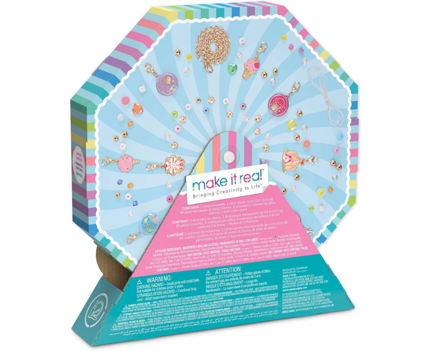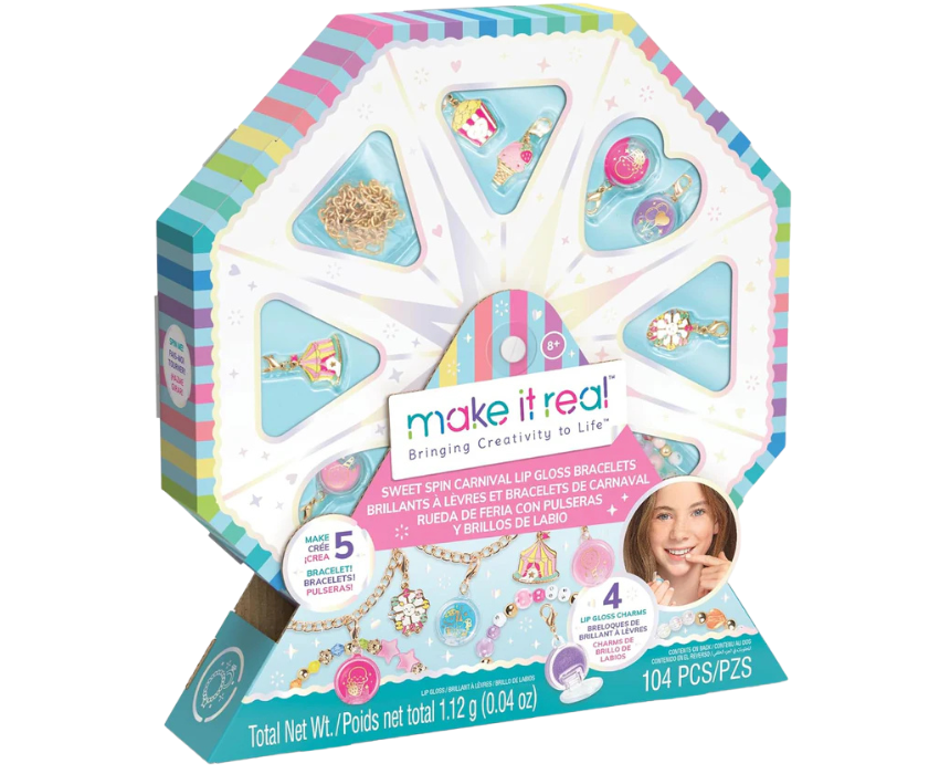 This DIY charm bracelet kit lets tweens create five stylish accessories with chic enamel charms inspired by carnival fun. It also includes four strawberry-scented lip gloss charms that add fragrance and color, combining fashion with kid-safe cosmetics tested to the highest standards. Perfect for ages 8 and up, it’s a trendy gift that encourages creativity, self-expression, and personalized style.