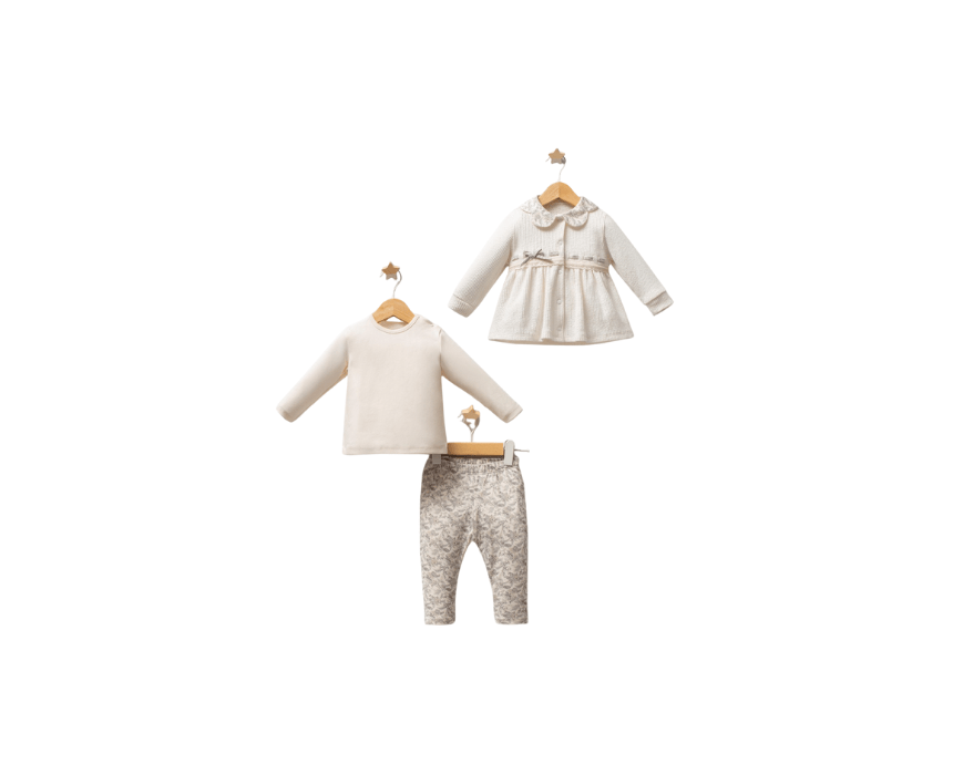 Light beige 3-piece set for babies aged 3–18 months. Soft, cozy, and stylish, perfect for everyday comfort and adorable outfits.