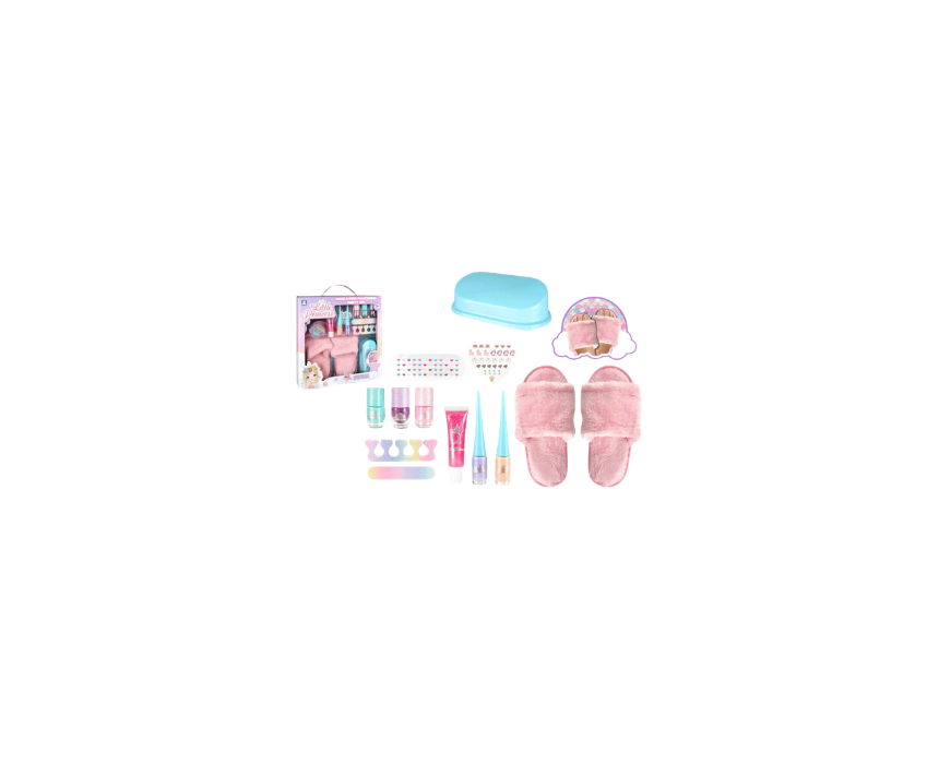 The Little Princess Mani & Pedi Party Set lets children enjoy pretend pampering with nail polish, lip gloss, nail files, and nail stickers. The set also includes pink fluffy slippers, creating a complete makeup and spa play experience. Kids can apply the makeup, decorate their nails, and wear the slippers for a fun, stylish spa day at home.