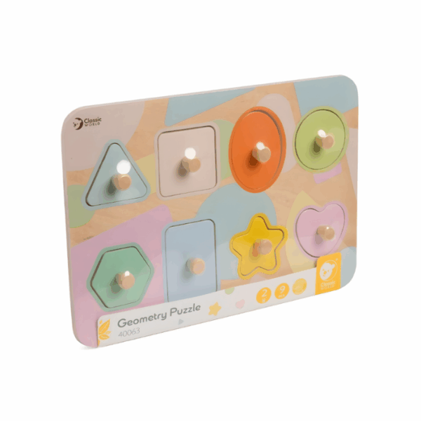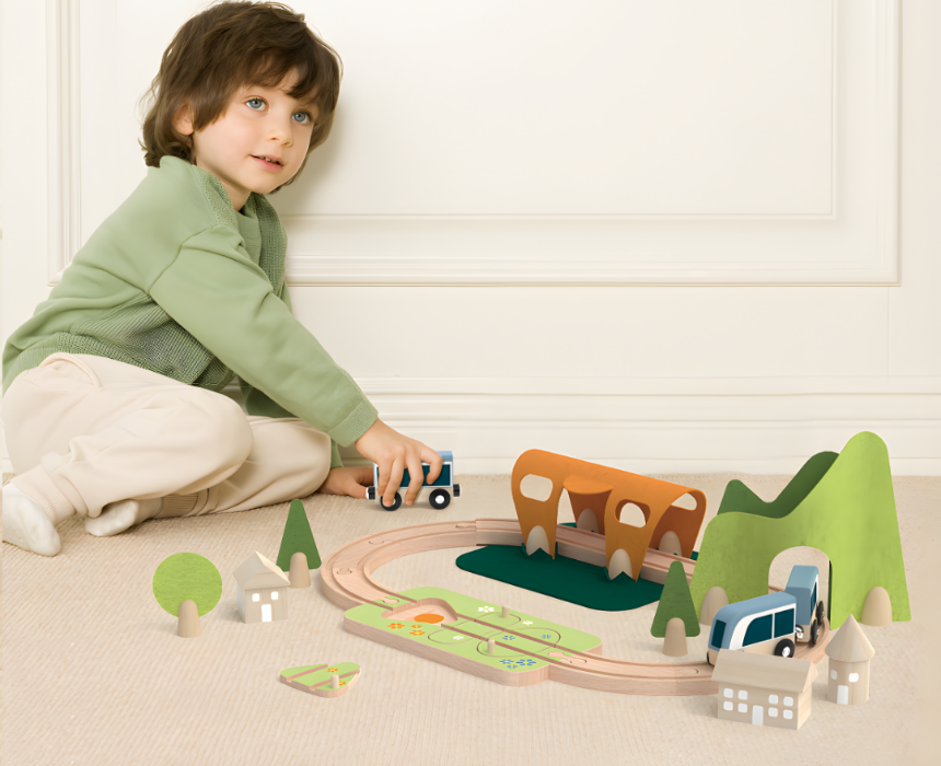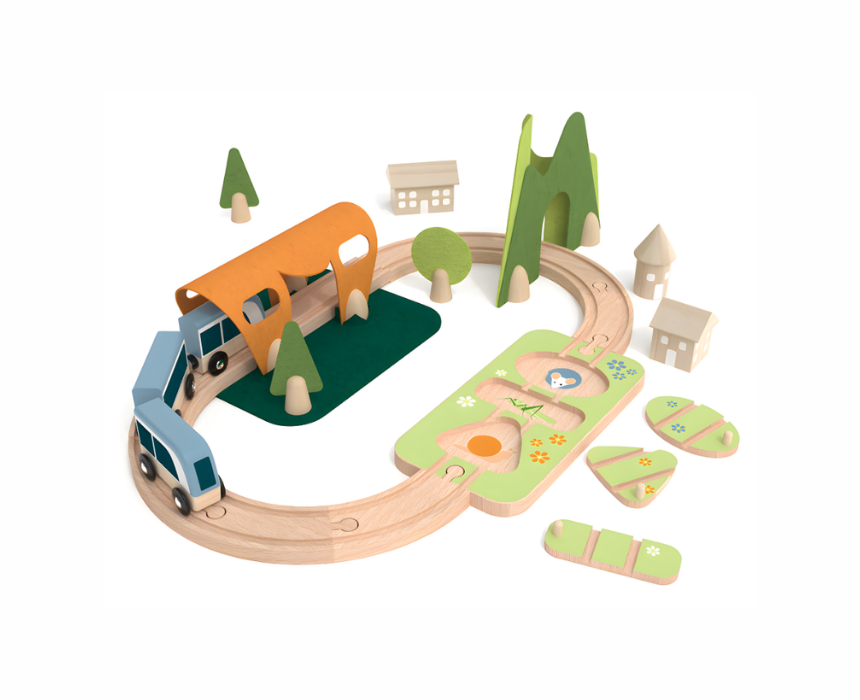 Designed for ages 3 and up, the Classic World Train Set includes 40 pieces with a tunnel, station, puzzle shapes, stackable blocks, and felt decorations. This interactive set encourages creativity, language development, fine motor skills, and coordination while children build and play. Made from FSC wood and recycled felt for eco friendly fun.