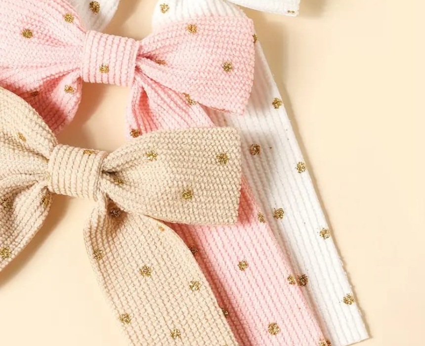 This Long Bowknot Hair Clip is a 15cm accessory adorned with delicate gold dots, offering a stylish hold for all ages. The elegant design provides a secure grip on medium to thick hair. Use it to elegantly pull back one side of your hair or to accentuate a simple ponytail or bun.