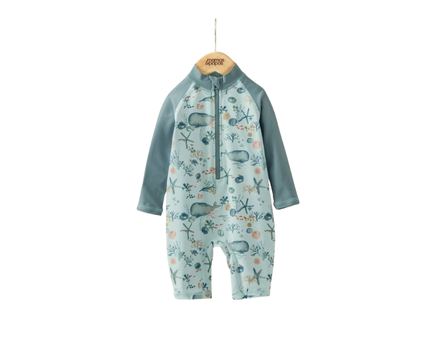 Long sleeve whale print rashsuit designed for comfort and protection, featuring a playful all over print, raglan sleeves, and contrast collar and arms. The front zip opening allows easy changing, making it practical for active days at the pool or beach while offering added sun protection. Ideal to pair with swim accessories for fun and safe outdoor water activities.