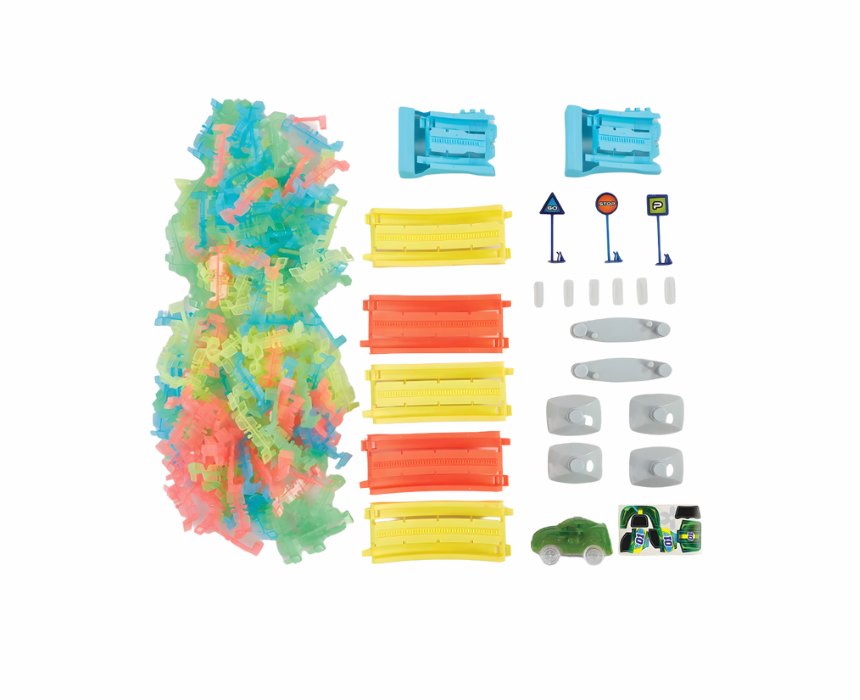 Designed for ages 5 and up, the ADDO Totally Tracks Glow Loop Race Track includes 165 pieces, a light up car, a 360 degree loop, road signs, and stands. The snap together tracks make glow in the dark racing easy and fun, encouraging creativity, imagination, and hands on building skills. Batteries required for the light up car.
