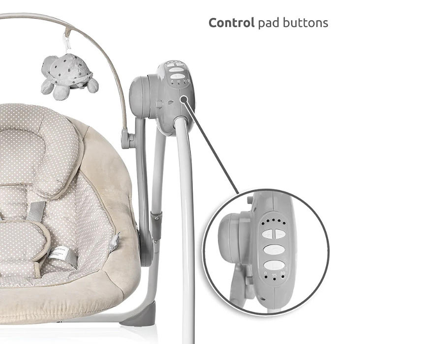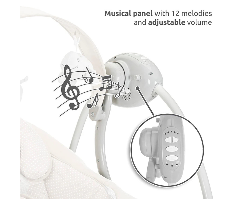 The LORELLI Portofino Electric Swing provides soothing motion with multiple swing speeds and gentle melodies designed to comfort and relax babies. Featuring a secure seat, adjustable settings, and a stable frame, it supports both safety and convenience during daily use. Its compact and modern design allows it to fit easily into any nursery or living space while blending with home decor.