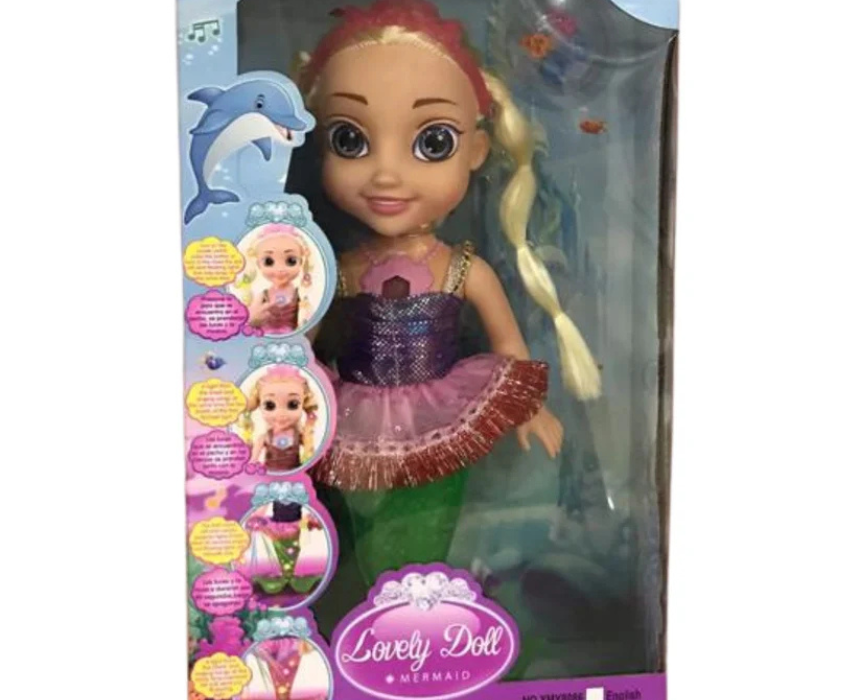The Lovely Doll Mermaid features a rainbow-colored light-up tail and plays music or sings songs for an engaging and interactive playtime experience. She can swim in water and comes with a hairbrush for styling, allowing children to create different hairstyles and enjoy imaginative underwater adventures. Kids can style her hair and pose her tail for colorful, fun storytelling during play.