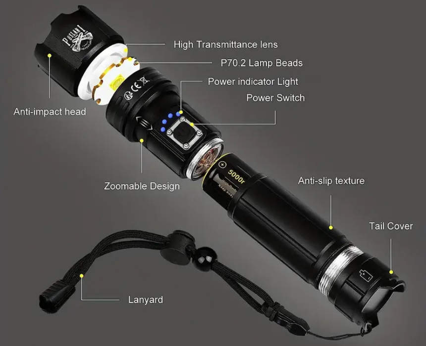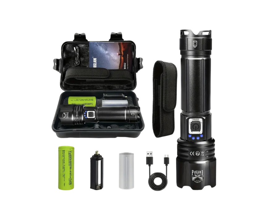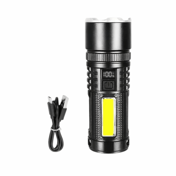 The 700 Lumens Rechargeable Tactical LED Flashlight delivers powerful illumination with 5 adjustable modes and a 400m beam range. Made from durable aluminum alloy, it features a USB Type-C rechargeable 5000mAh battery for long-lasting use and comes with a belt clip and hand strap for easy portability. Ideal for outdoor activities, camping, and everyday tasks, it provides reliable lighting whenever needed.