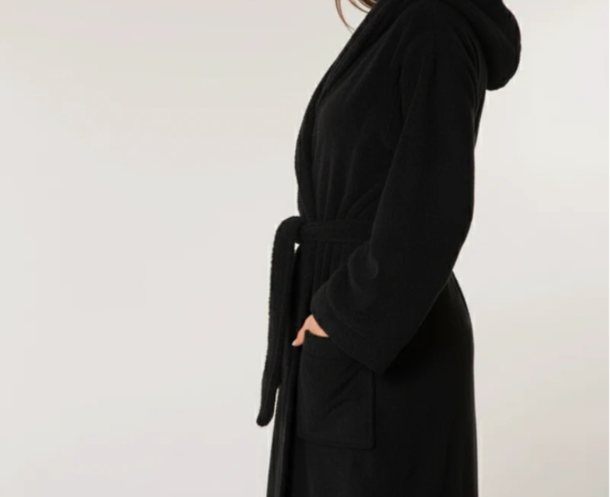 The Luxury Hooded Bathrobe in black is made from soft, absorbent cotton, offering ultimate comfort for lounging or post-shower relaxation. It features a hood, tie belt, and convenient pockets for a cozy, practical fit. Its sleek black design adds a touch of elegance, making it perfect for everyday wear or as a luxurious gift.