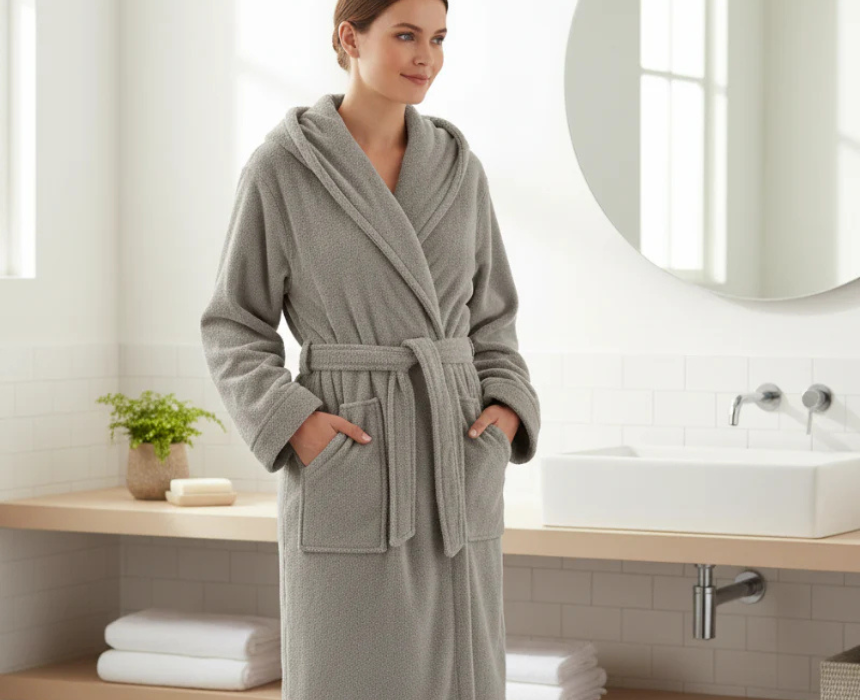 The Luxury Hooded Bathrobe in light grey is made from soft, absorbent cotton, offering cozy comfort for lounging or post-shower use. It features a hood, tie belt, and practical pockets for a comfortable and functional fit. Its neutral light grey color and elegant design make it perfect for daily wear or as a thoughtful gift.