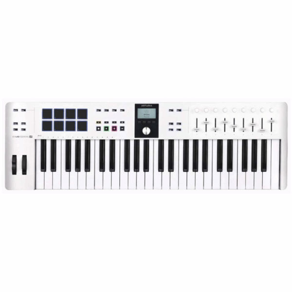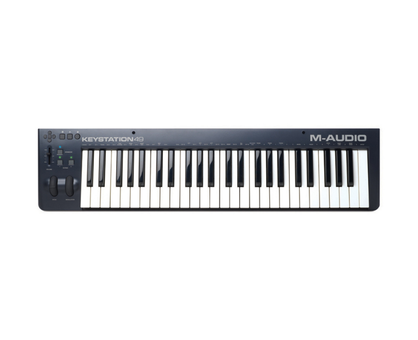 This compact 49 key USB MIDI controller features velocity sensitive synth action keys for expressive performance and smooth playability. It includes assignable volume and modulation wheels along with octave up and down buttons to extend the playable range. A sustain pedal input and USB bus powered plug and play design make it easy to use in any setup, while its lightweight form is ideal for home studios and mobile music production.