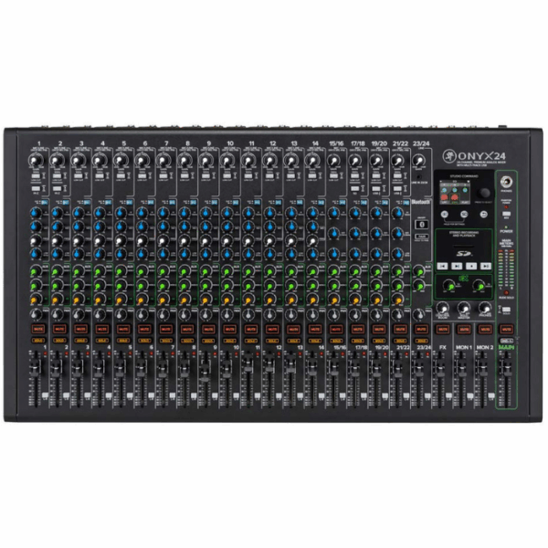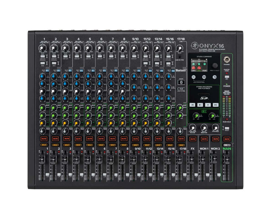 This premium 16 channel analog mixer features 10 Onyx mic preamps with high dynamic range for clean and detailed sound. It includes 3 band EQ on all channels, 4 aux sends, and 4 subgroups for flexible mixing and routing. A built in 24 bit 96 kHz USB audio interface allows direct recording and playback, while the integrated effects section adds creative control. The rugged steel design makes it ideal for professional studio and live sound use.