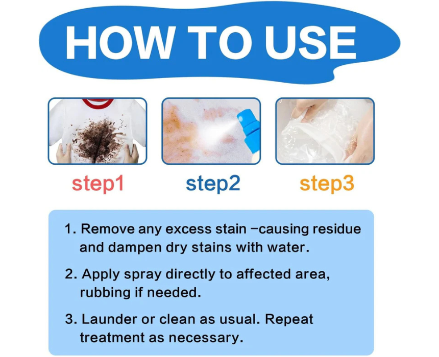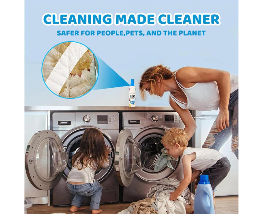 The Powerful Stain Remover Spray quickly eliminates tough stains from juice, milk, food, ketchup, and more. Its eco-friendly formula is safe for kids and adults, offering fast, easy cleaning with an even spray for full coverage. Compact and portable, it’s perfect for removing stains from clothes, towels, sheets, and diapers anytime, anywhere—just spray, rub, and rinse for spotless results.