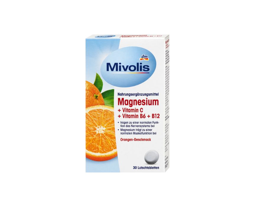 Mivolis Magnesium + Vitamin C + Vitamin B6 + B12 Lozenges (30 pcs, 45 g) provide essential nutrients to support normal muscle and nerve function, energy metabolism, and immune health. With a pleasant orange flavor, these lozenges help reduce tiredness and fatigue, especially during physical activity. Simply dissolve one lozenge slowly in the mouth daily to support overall wellbeing and maintain balanced nutrient levels.