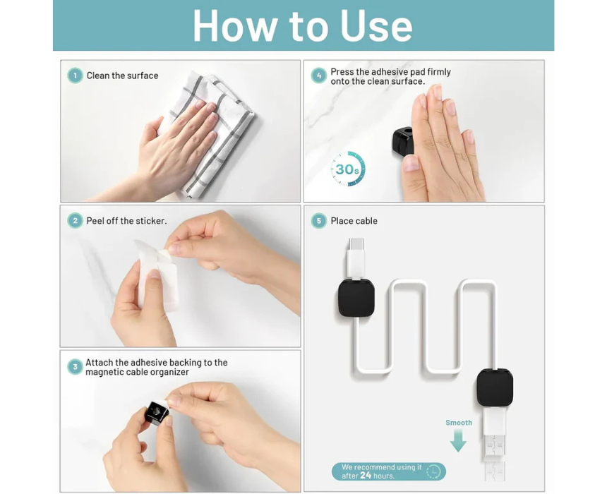 These 6 magnetic cable clips make organizing cables effortless and clutter-free. With a strong magnetic hold, they keep cords neatly in place at home, in the car, or at the office. Reusable, movable, and residue-free, they offer a clean and convenient way to manage all your charging and data cables.
