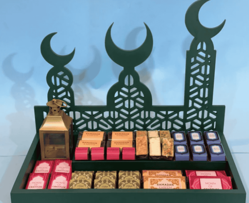 A statement Ramadan tray designed with architectural-inspired detailing and a Ramadan Kareem message centerpiece. This generous arrangement brings together premium Belgian chocolates and traditional Arabic sweets in a striking presentation, making it an impressive gift or a stunning focal point for your gatherings.