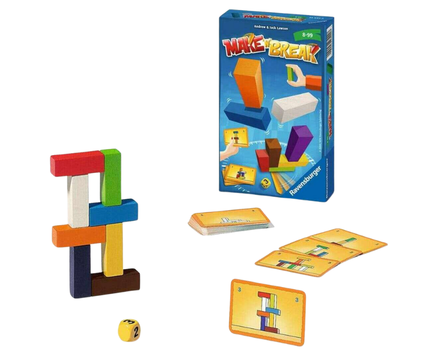 The Make ‘n’ Break Compact Game delivers fast-paced building fun as players recreate structures from task cards under time pressure. The set includes 8 wooden blocks, 30 building cards with 60 tasks, and a dice for timing, challenging players to be the quickest and most accurate builder. Perfect for children and families, this compact game sharpens spatial skills, hand-eye coordination, and quick thinking in an exciting, competitive format.