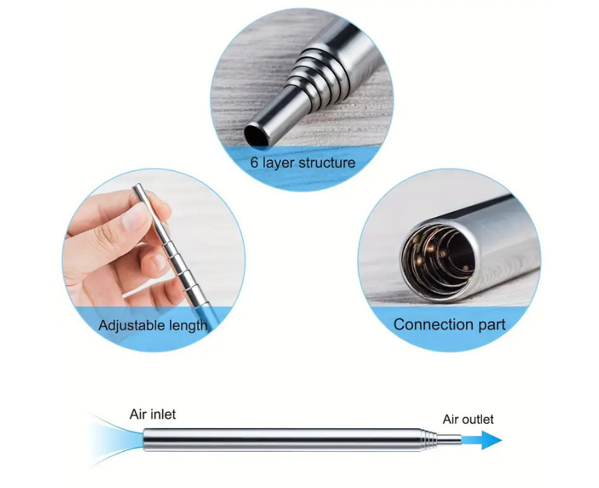 This stainless-steel fire blower features a retractable design for easy storage and portability, making it ideal for camping, hiking, and outdoor use. Built for durability and heat resistance, it directs airflow efficiently to help start fires faster with minimal smoke. Lightweight and compact, it fits easily into any gear setup for reliable fire starting on the go.