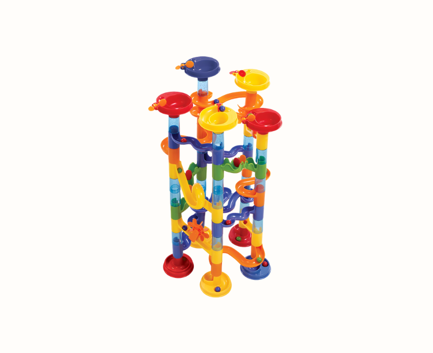 Designed for ages 4 and up, this ADDO Marble Rally playset lets children build exciting race tracks filled with drops, twists, and turns. With over 75 pieces including track parts and marbles, kids can follow the instructions or create their own designs while developing creativity, problem solving, and fine motor skills.