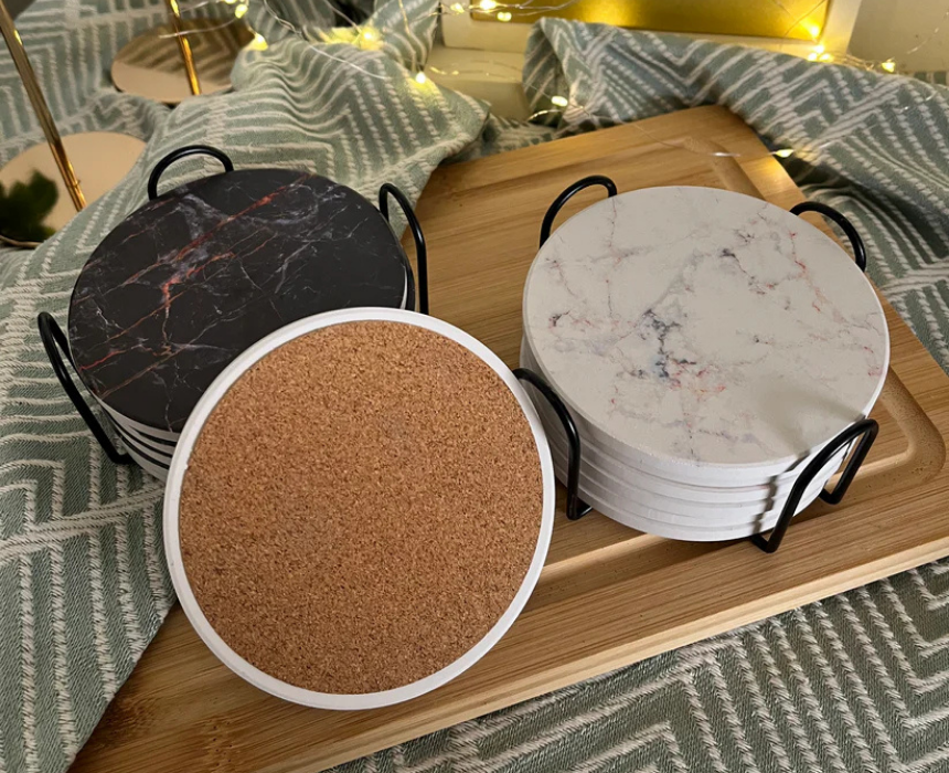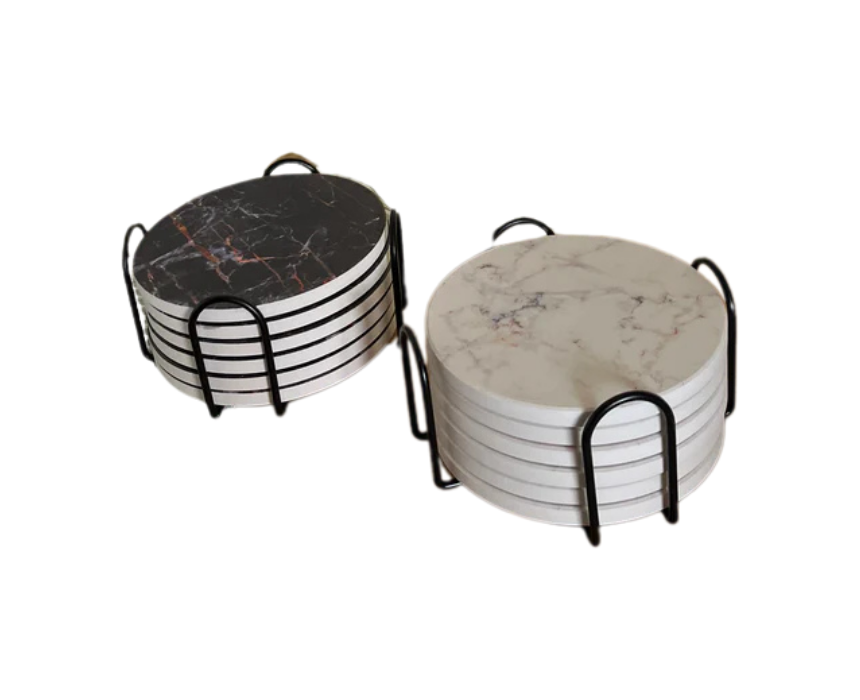 The Marbled Coasters Set with Metal Stand includes six elegant black or white coasters, accompanied by a sturdy metal stand. Designed to protect surfaces from moisture and heat, these coasters combine practicality with a sophisticated aesthetic. Perfect for home or office use, they add a stylish and functional touch to any table or countertop.