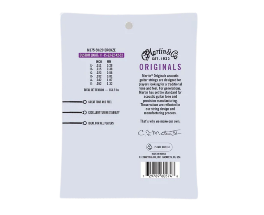 Martin MA175 Bronze Acoustic Guitar Strings are a 6-string set crafted with 80/20 bronze wrap and bronzed steel core for bright, clear tone. This extra light+ gauge set provides easy playability while maintaining balanced sound and projection. Ideal for acoustic guitarists seeking classic, reliable performance for practice, recording, or live play.