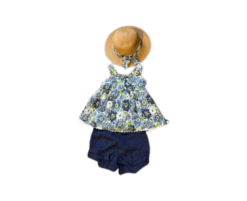 <p>This charming outfit for toddler girls pairs a sleeveless floral top in blue yellow and white with navy shorts for a coordinated look. The top features buttons down the front and delicate eyelet or scalloped trim at the hem. Complete the summer ready style with a tan or cream straw sun hat accented with a matching floral ribbon bow for sunny days or casual outings.</p>