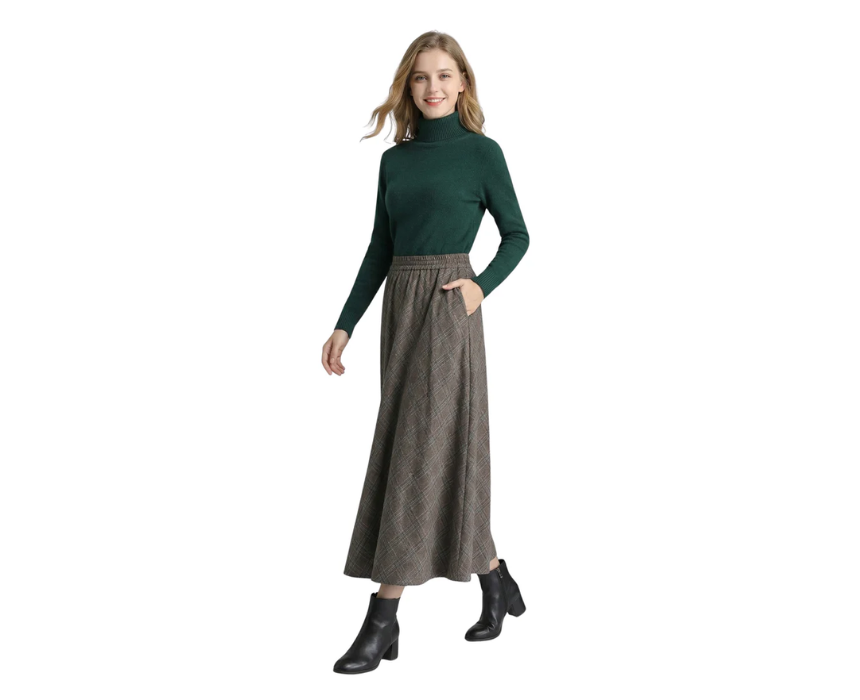 This maxi brown checked skirt with side pockets features a flowing long length, a classic check pattern, and convenient side pockets for everyday use. The warm brown tone makes it easy to pair with casual tops, knitwear, or tucked-in blouses for a chic and comfortable look.