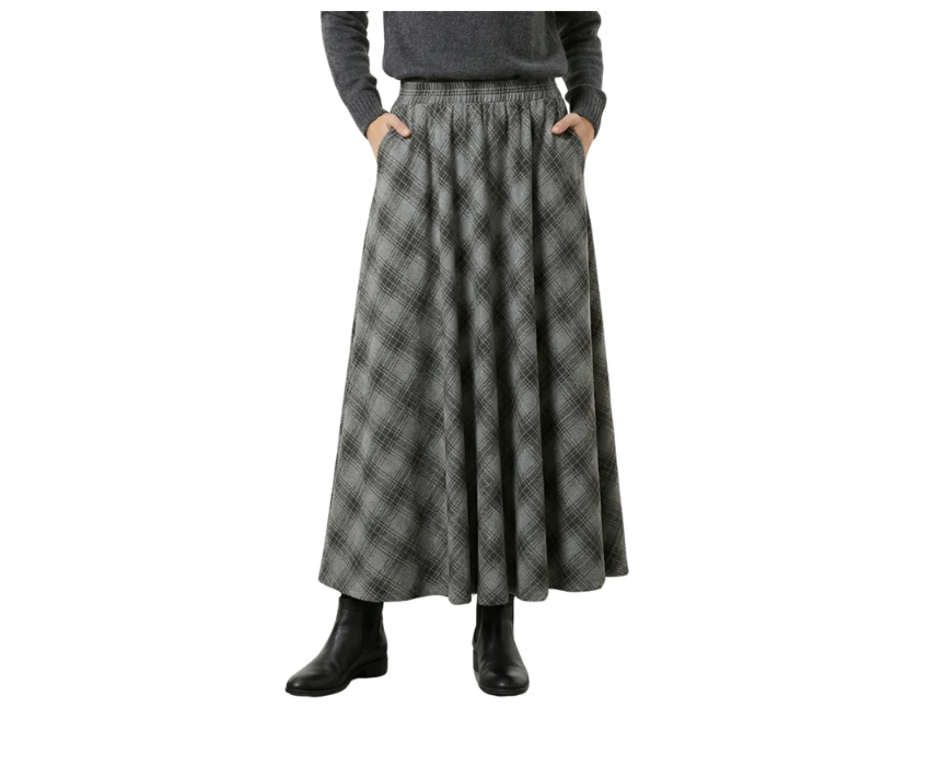 This maxi grey checked skirt with side pockets features a flowing long length, a timeless check pattern, and practical side pockets for daily wear. The neutral grey shade makes it easy to pair with knitwear, blouses, or simple tops for a comfortable and stylish outfit.